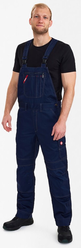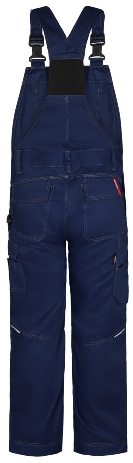 Functional dungarees with contrasting topstitching. High-cut back with wide elasticated waistband and adjustable straps. Chest pocket with compartments for pens and chest pocket with zipper. Optimum fit, ergonomically shaped knees. Adjustable waist size. Two spacious, slanted slit pockets at the front. Two back pockets with flap. Thigh pocket with flap and inserts for pens, for example. Free-hanging, reinforced folding rule pocket with extra compartments guarantees optimum freedom of movement. Adjustable hammer loop. Reinforced knee pocket with two adjustment options for knee pads. Reinforced hem on trouser legs for extra wear resistance. High visibility thanks to reflective piping in the middle of the back of the trouser legs. The trouser legs have an extra wide turn-up so that the inseam can be extended if required. For an extra-long leg length, simply open one hem, which conceals an additional hem.