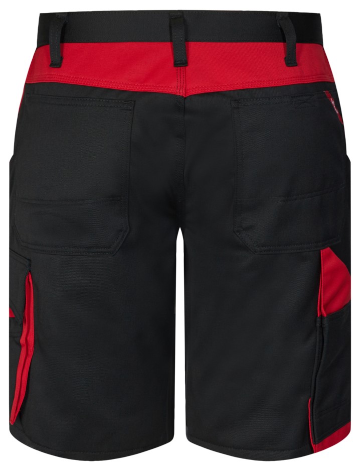 Work shorts with triple topstitching and pleats. Two slit pockets and one coin pocket. Fly with metal zipper. Dark-colored metal trouser button. Two back pockets, the right one with Velcro fastener. Reinforced folding rule pocket with expansion pleat on the right. Thigh pocket and cell phone pocket with expansion pleats and flap with Velcro fastening and additional pencil pockets on the left. Suitable for industrial laundering.