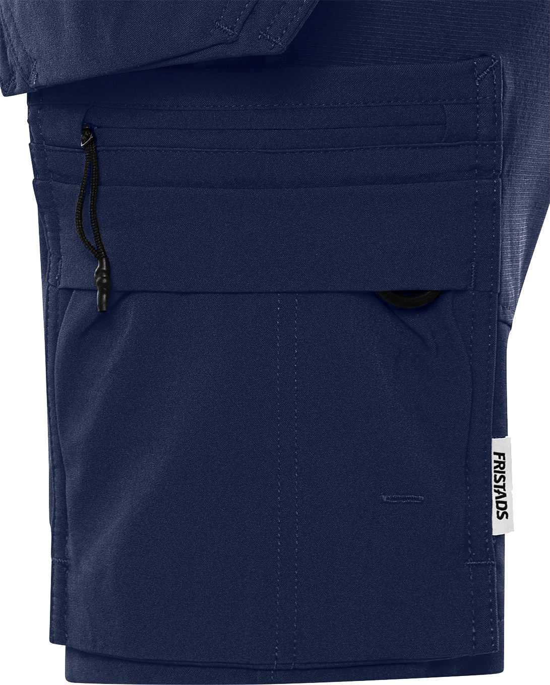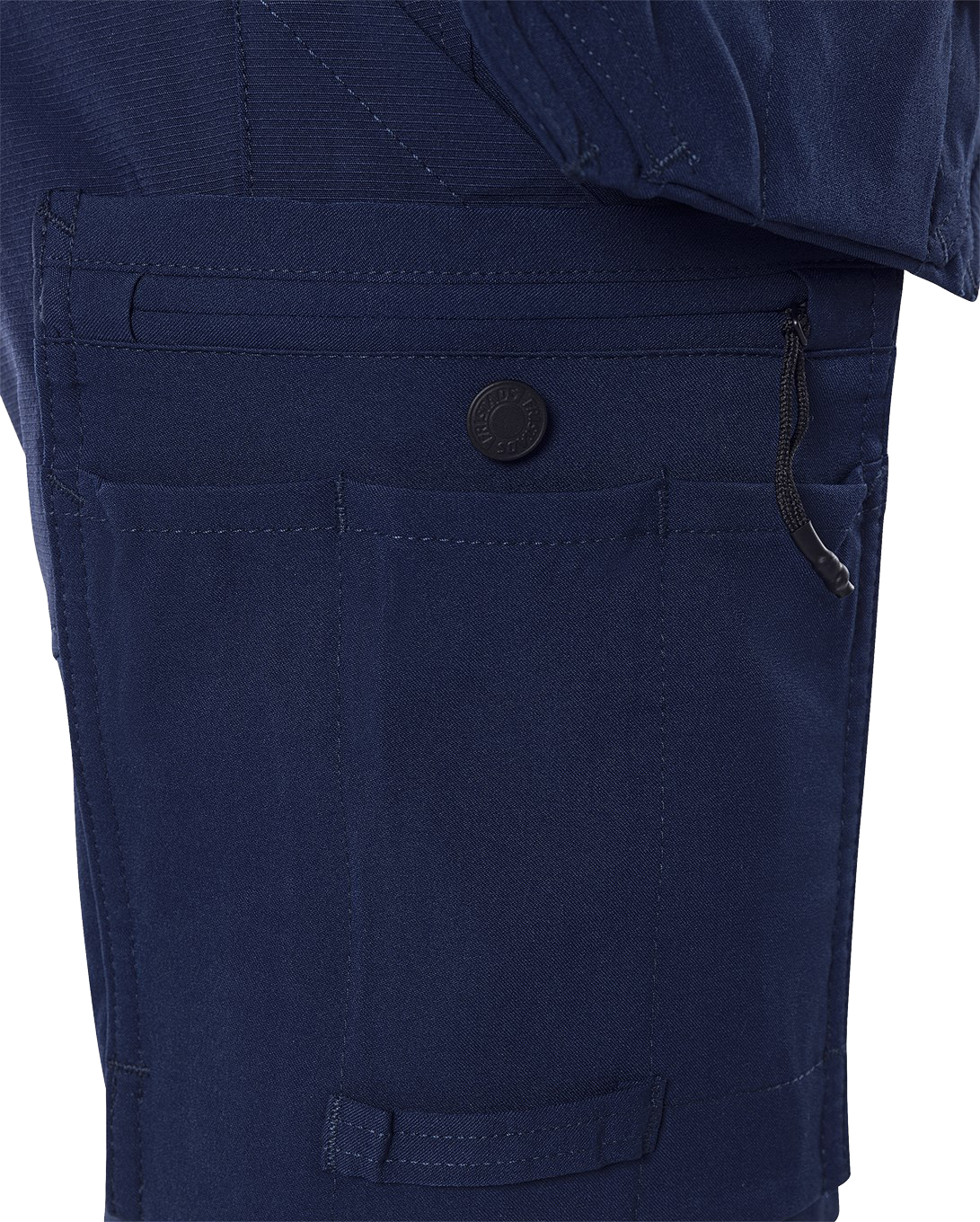 Ruler pocket in ripstop stretch, leg pocket with snap fastener, zippered pocket, pen pocket, 2 tool pockets and button and loop for a work knife