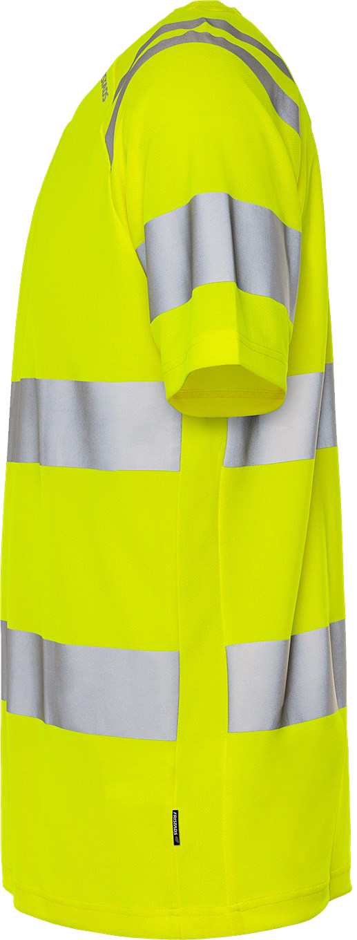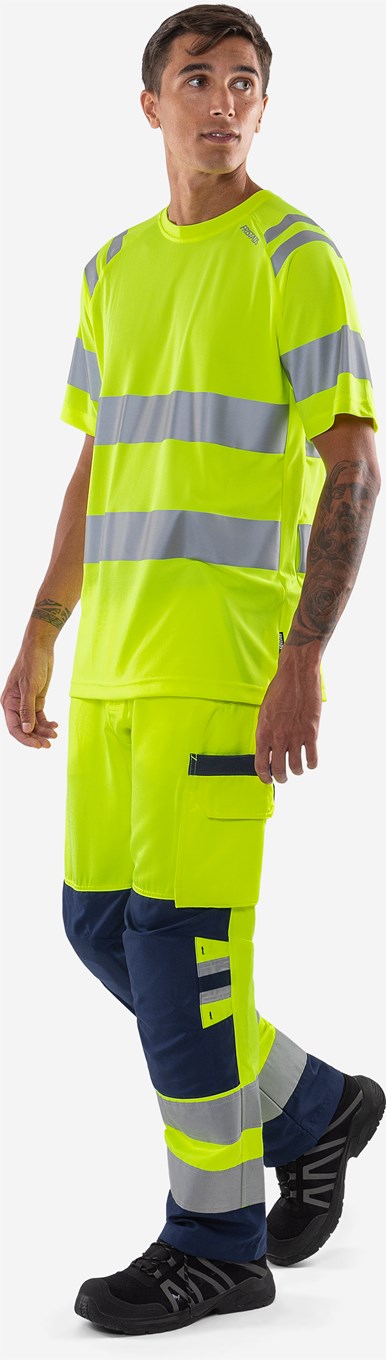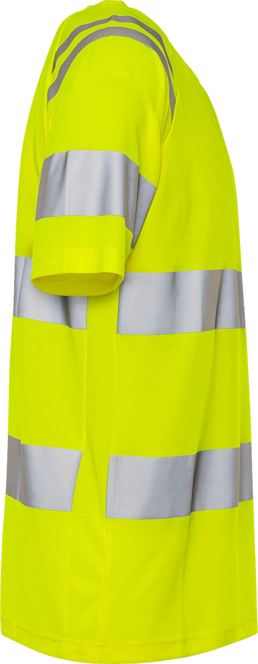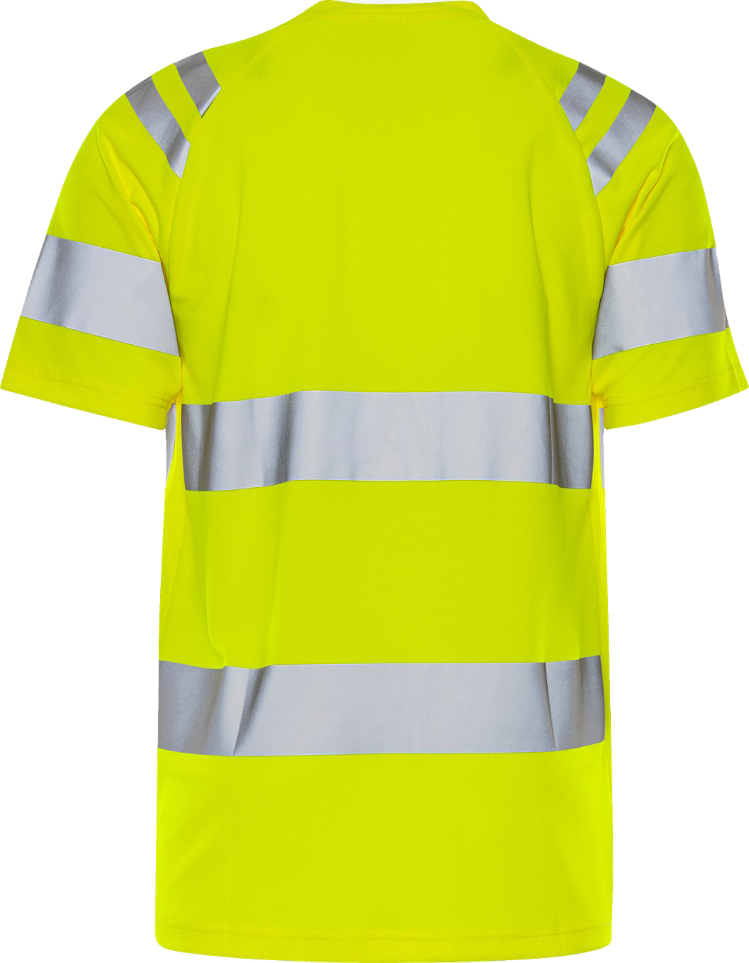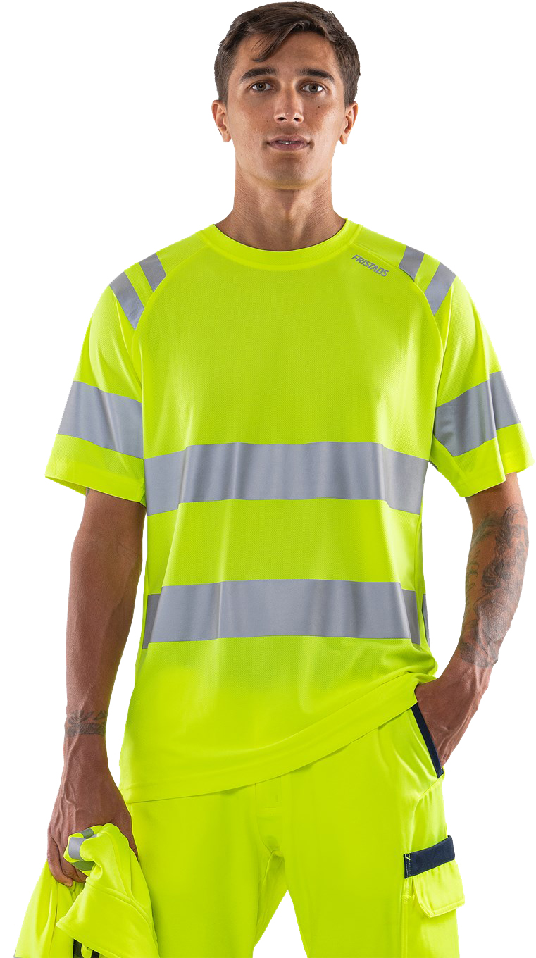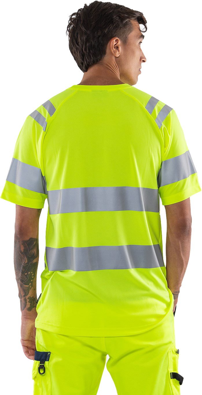 High visibility T-shirt made from recycled material in a functional knit for better breathability. This light and airy T-shirt is a good choice for warm working days. Concept: Trofta