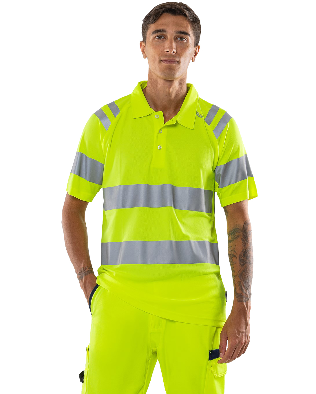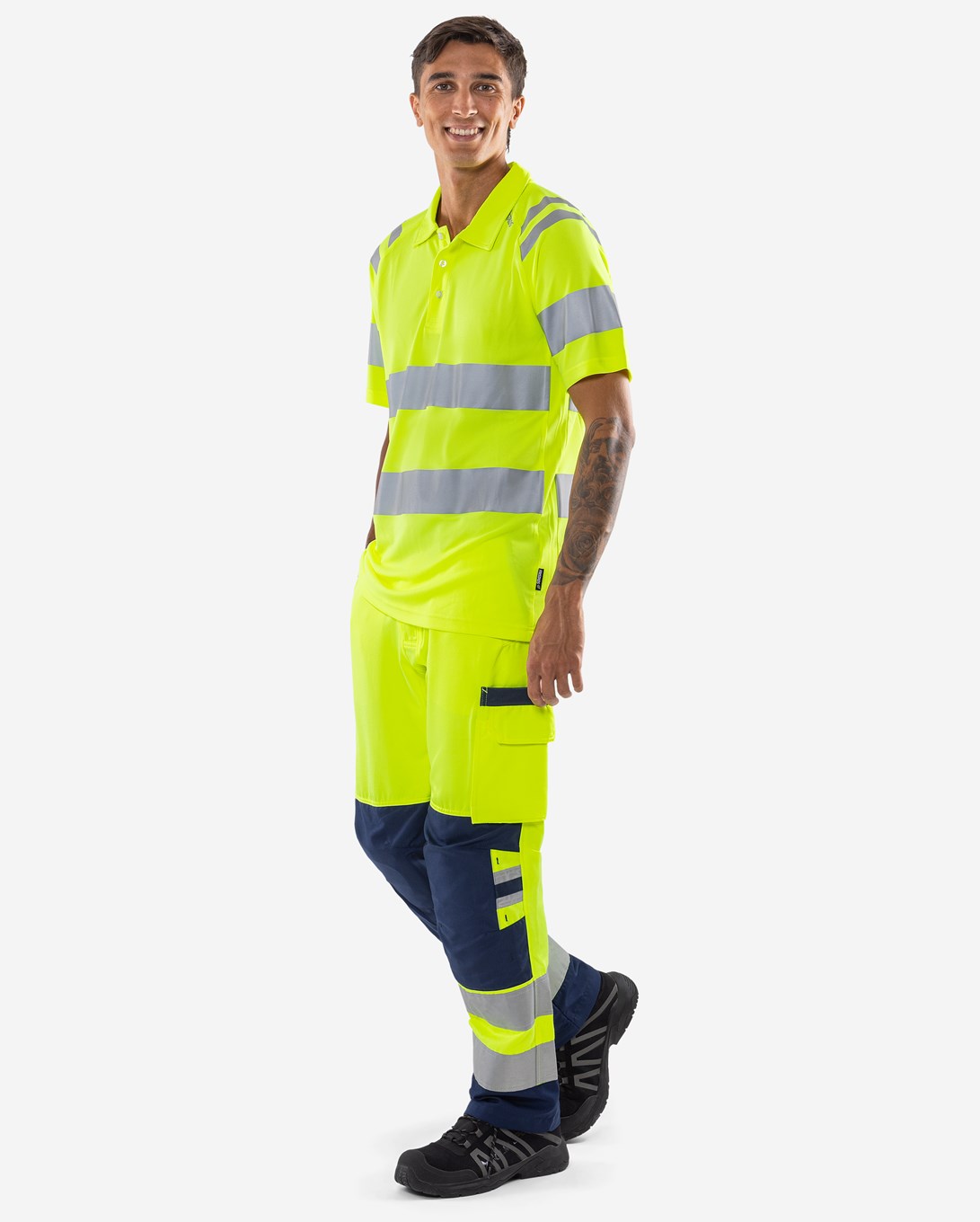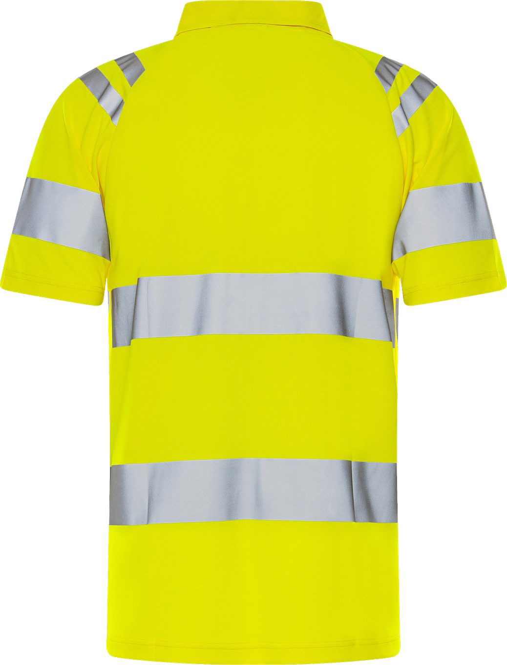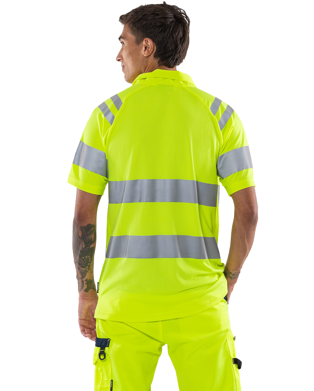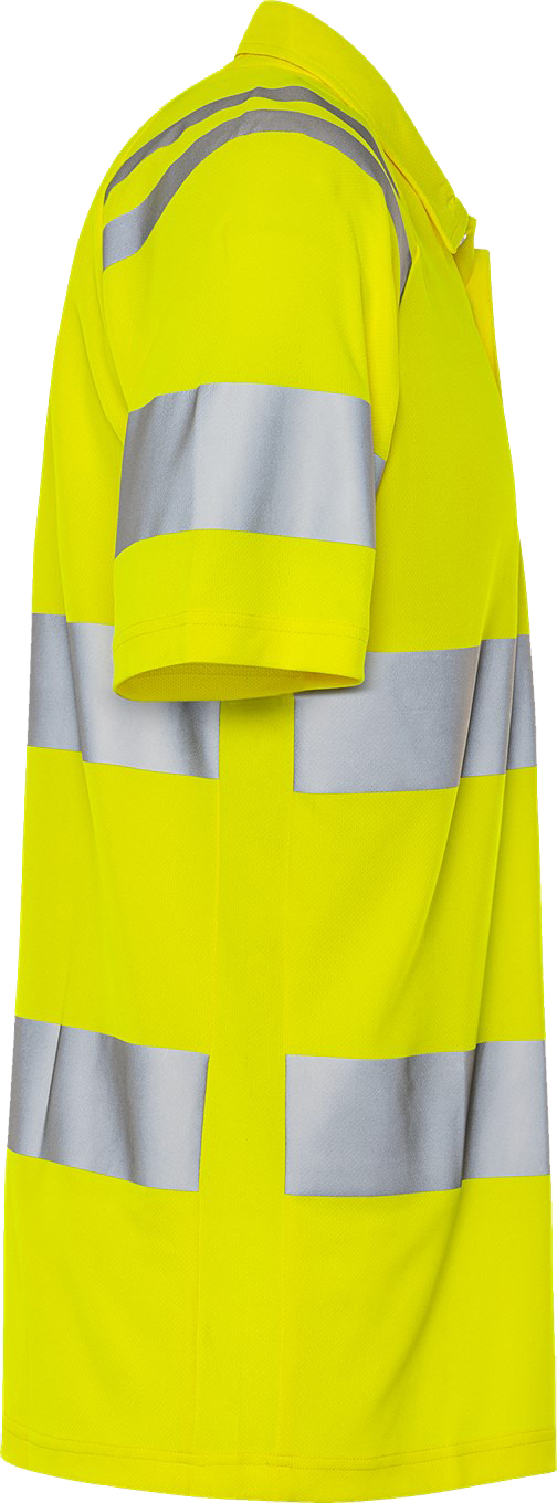 High visibility polo shirt made from recycled material in a functional knit for better breathability. This light and airy polo shirt is a good choice for warm working days. Concept: Trofta