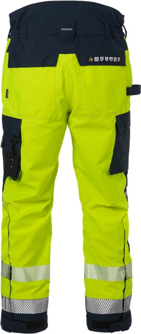 Flamestat High Vis GORE-TEX trousers with PYRAD® technology. The ultimate multinorm protection with high comfort in very lightweight GXE material. Market leading and unique. High-visibility trousers in 2-layer GORE-TEX PYRAD® fabric, durably wind and waterproof, breathable and dirt and oil repellent. With light lining, removable elastic straps, 2 front pockets with flap and zipper &2 back pockets with flap and concealed press stud closure.