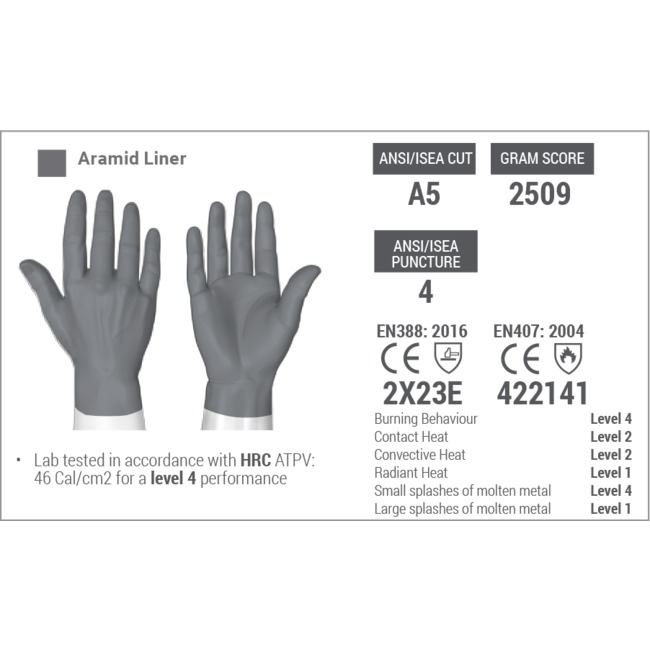 EN407:2004 certified for Burning Behavior Level 4, Contact Heat Level 2, Convective Heat Level 2, Radiant Heat Level 2, Small splashes of molten metal Level 4, and large splashes of molten metal Level 1