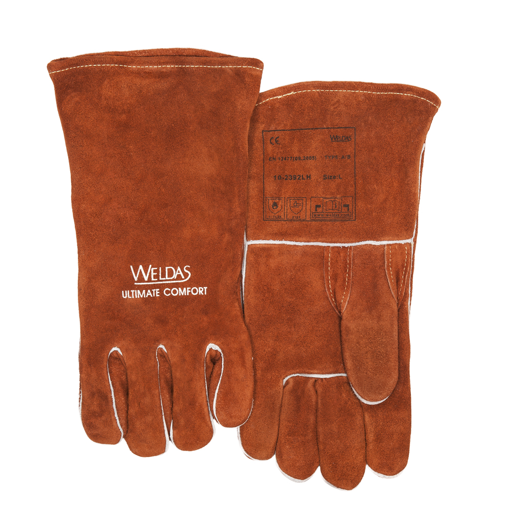 Welding glove with straight and reinforced thumb for MIG/MAG welding, made of cow split leather.