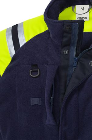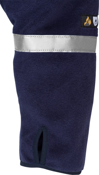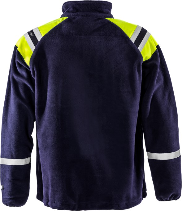 Fleece jacket with inherent flame protection, suitable for ATEX environments, without metal parts. Suitable for industrial washing.