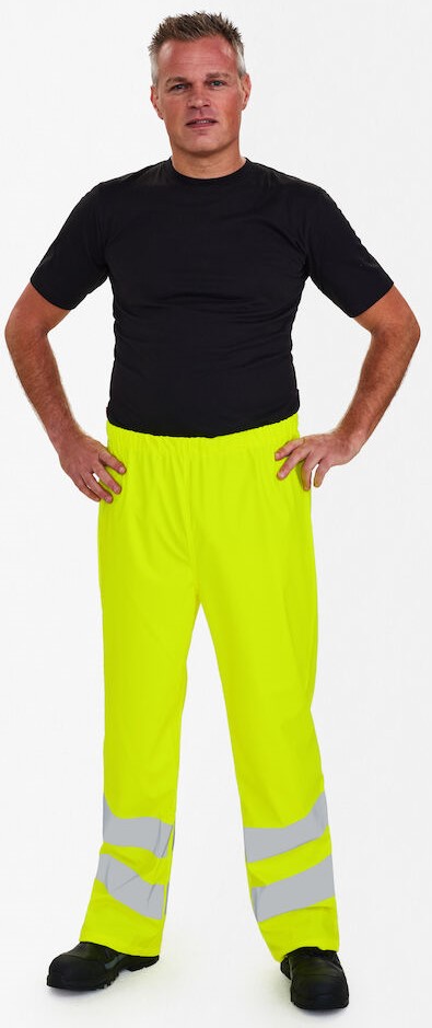 Functional rain trousers with taped seams. Adjustable elasticated waist. Functional folding rule pocket. Adjustable leg width at the cuffs. Clothing class 2, tested after 5 washes