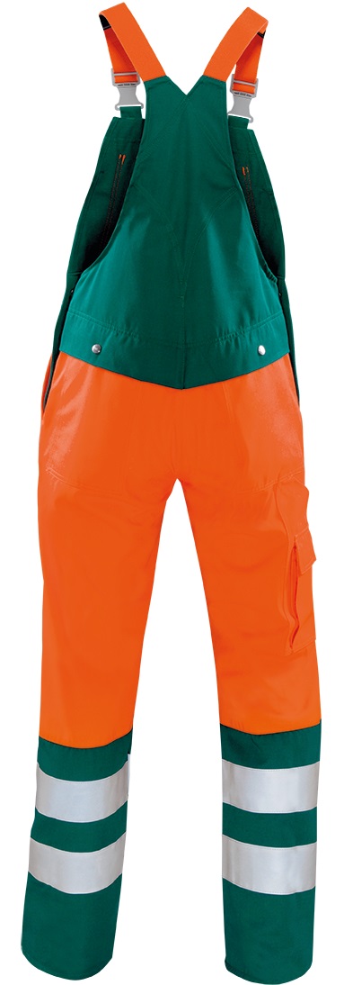 The rofaWARNSCHUTZ dungarees Duo-Color meets the standard for highly visible warning clothing and makes the wearer visible all around even in poor visibility and darkness. The material is particularly tear and abrasion resistant as well as water, oil and dirt repellent. The adjustable waistband and stretch straps provide optimal support and a pleasant wearing comfort. Striking contrasting design elements and the intelligently placed reflective stripes on the trouser leg create a modern and dynamic appearance. Various bag solutions offer sufficient storage space and can be used individually.Design: Stretch straps, bib pocket with flap and press stud, slit with zip, waistband adjustable by side button placket, 2 side pockets, 2 hip pockets with flap and press stud, right back folding rule pocket with attached mobile phone pocket with flap and Velcro, 70mm reflective stripes around legsMaterial/quality: fabric 39, satin, 80% polyester, 20% cotton, approx. 290 g/qm, FCStandard: EN ISO 2047