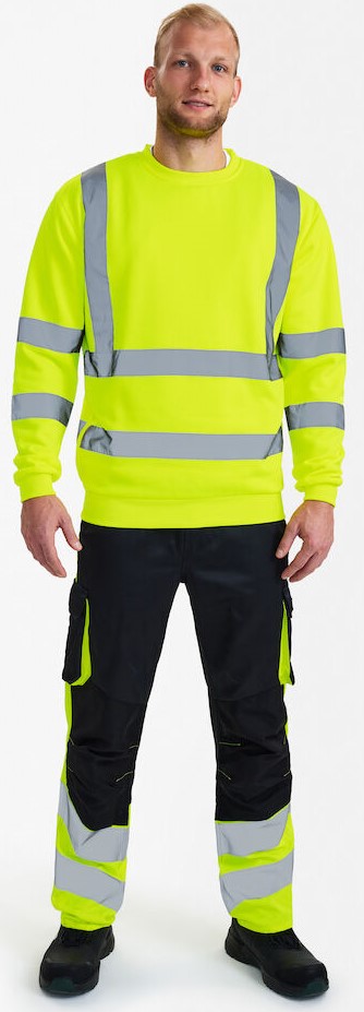Functional and stylish fluorescent sweatshirt. Brushed inside, making it soft and comfortable. Ribbed neckline, sleeves and hem. Reflective stripes sewn over the shoulders and around the sleeves and waist. Clothing class 3, tested after 25 washes.