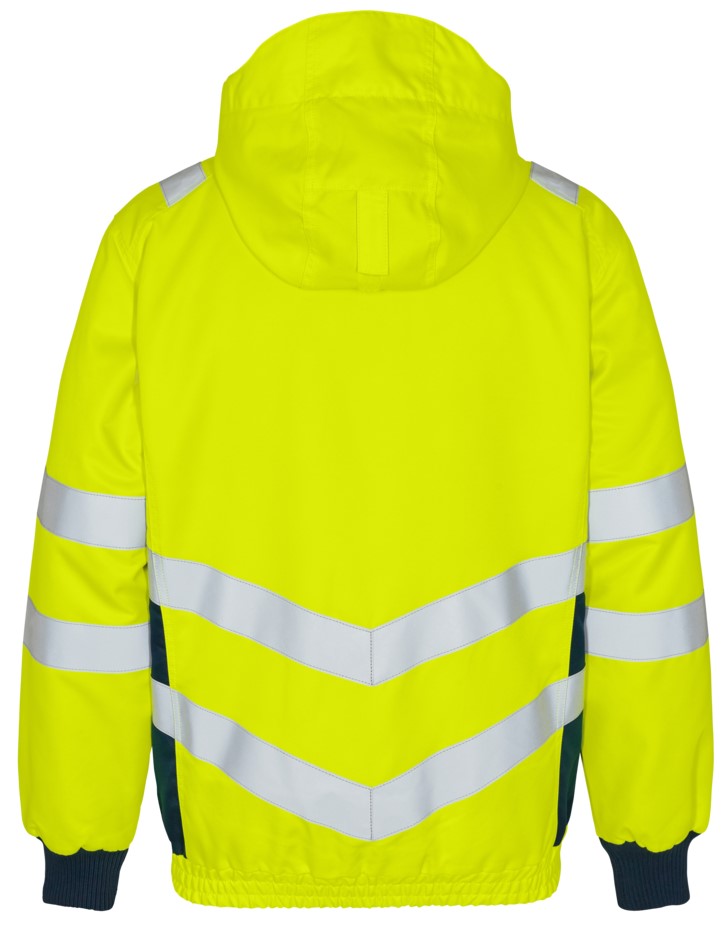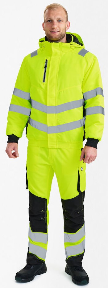 Fluorescent, wind and water-repellent pilot jacket with a modern cut. High collar with fleece inside. Double button placket with zipper and Velcro fastener at the front. Two spacious side pockets and chest pocket with zipper. Two inside pockets, one with zipper. Detachable, adjustable hood with sufficient space for a work helmet. Elasticated bottom hem and ribbed cuffs. Zipper in the lining suitable for printing/embroidery. Reflective stripes over the shoulders and around the sleeves and waist. Clothing class 3, tested after 50 washes.
