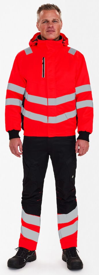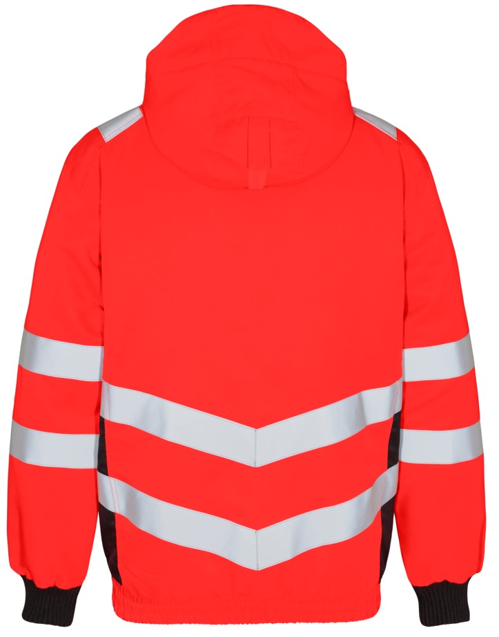Fluorescent, wind and water-repellent pilot jacket with a modern cut. High collar with fleece inside. Double button placket with zipper and Velcro fastener at the front. Two spacious side pockets and chest pocket with zipper. Two inside pockets, one with zipper. Detachable, adjustable hood with sufficient space for a work helmet. Elasticated bottom hem and ribbed cuffs. Zipper in the lining suitable for printing/embroidery. Reflective stripes over the shoulders and around the sleeves and waist. Clothing class 3, tested after 50 washes.