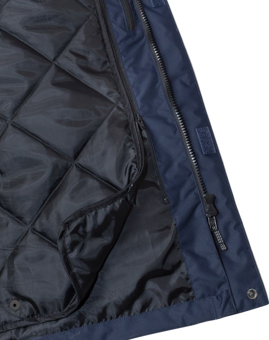 - Concealed 2-way zip with press stud fastening to upper collar edge