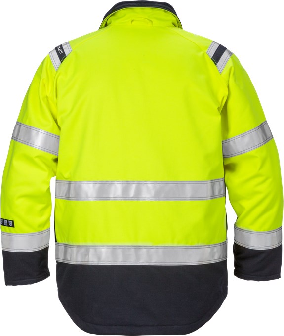 High visibility certified winter jacket with inherent flame protection, suitable for ATEX environments, without metal parts. Suitable for industrial washing.Standards:
