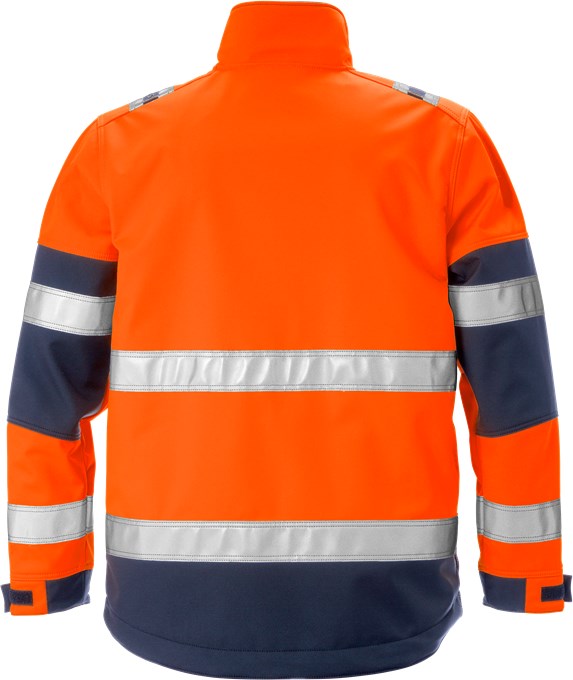 Modern high-visibility jacket made of robust and stretchy softshell material for protection against wind and rain, with functional pocket solutions.