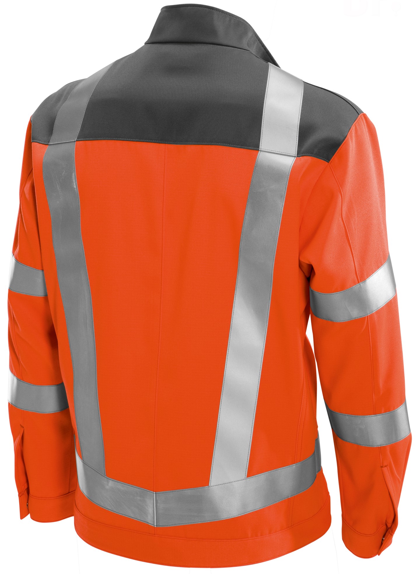 Made for you: 360° visibility, lockable cuffs, permanent flame protection, regular fit. Product Description: Standards: EN ISO 20471 high visibility class 2, from size 48/50 class 3 EN 1149-5 electrostatic dissipative protective clothing EN 13034-6 chemical protection type 6 IEC 61482-2 arc fault protection class 1 EN ISO 11611 Welding protection class 1-1A EN ISO 11612 Heat and flame protection A1, B1, C1, F1 Outer fabric: 31% polyester, 28% modacrylic, 20% viscose, 20% aramid, 1% other fibers Fabric weight: 320 g/m² stand-up collar, concealed press stud placket, 2 breast pockets closable with flap, 2 side pockets closable with flap, 1 inside pocket, 1 inside cell phone pocket with flap, closable cuffs 2 reflective stripes on each sleeve, 1 circumferential reflective stripe above the waistband, 2 circumferential vertical reflective stripes in the front and back 60° normal wash cycle Sizes: 44/46N - 64/66N ; 44/46L - 56/58L Colors: warning orange/dark gray ; warning yellow/dark g