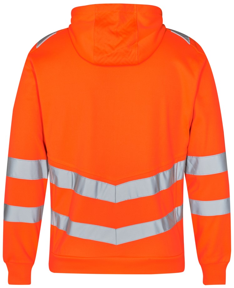 Functional, fluorescent sweat cardigan in a modern, attractive design with stretch lining. Lightly brushed inside, making the fabric soft and comfortable. Reflective zipper at the front. Two spacious side pockets and a chest pocket, each with a zipper. The sweat cardigan has a waffle texture on the front and hood. Ribbed knit at the bottom of the sleeves and hem. Stretchy reflective stripes across the shoulders and around the sleeves and waist. Clothing class 2, tested after 25 washes.