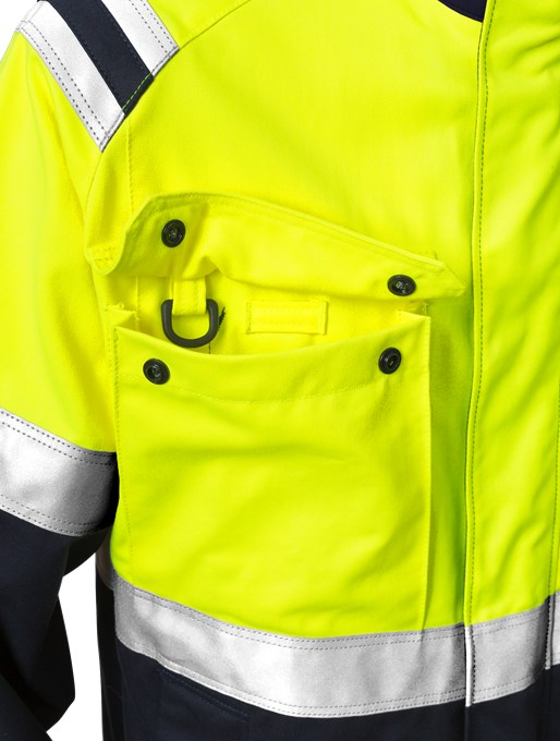 2 patch breast pockets with flap and concealed press stud strip - one with internal D-ring and pen loop, the other with opening for radio aerial