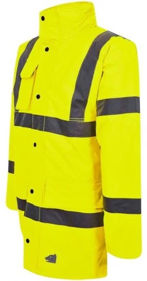 High-visibility parka, neon yellow, quilted lining, reflective stripes, button placket, hood in the collar - adjustable by means of a cord, two hip pockets with flaps, one cell phone pocket, one inside pocket