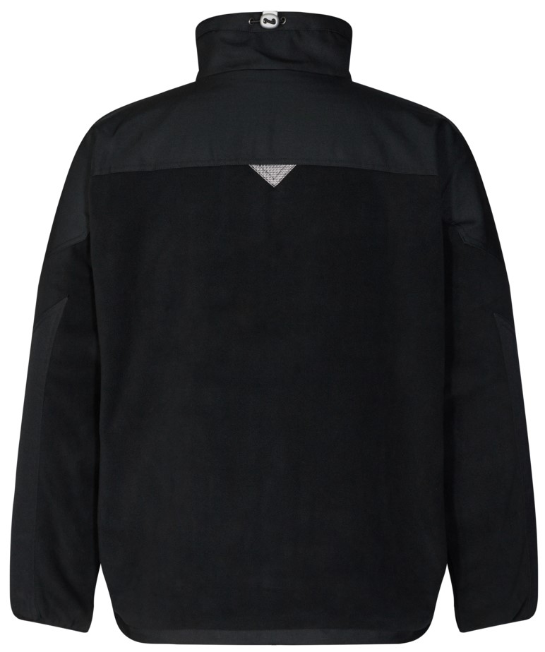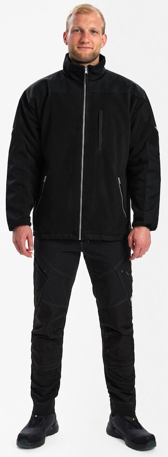 Fleece jacket with reinforced canvas shoulders and sleeves. Collar with fleece lining and cord stopper. Coarse front zipper in matching color design. Vertical breast pocket with zipper. Two side pockets with zipper. Slip lining on the inside.