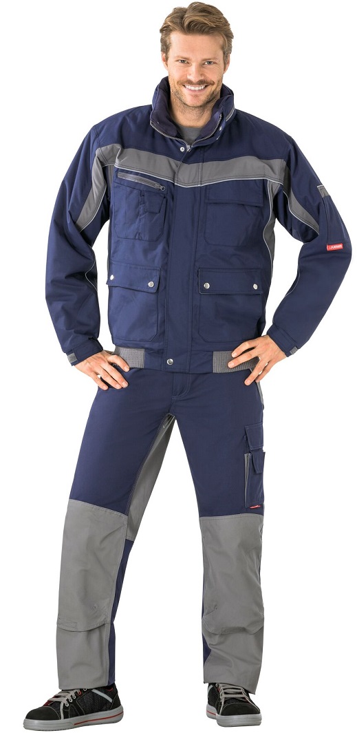 Atmungsaktiv, wasserdicht, Nähte hinterklebt, Fleecekragen, Reflexbiesen als Sicherheitsausstattung, Kapuze im Kragen, 1 Brusttasche links mit Patte und Klettverschluss, doppelte Brusttasche rechts, Handytasche auf der rechten Brust, 2 Stiftfächer, 2 seitliche Einschubtaschen, 2 aufgesetzte Seitentaschen, Ärmeltasche links, Dokumententasche unter der Frontpatte, Innenfutter gesteppt, verdeckter Frontreißverschluss, Strickbündchen am Bund, elastische Ärmelbündchen durch Klettband verstellbar.