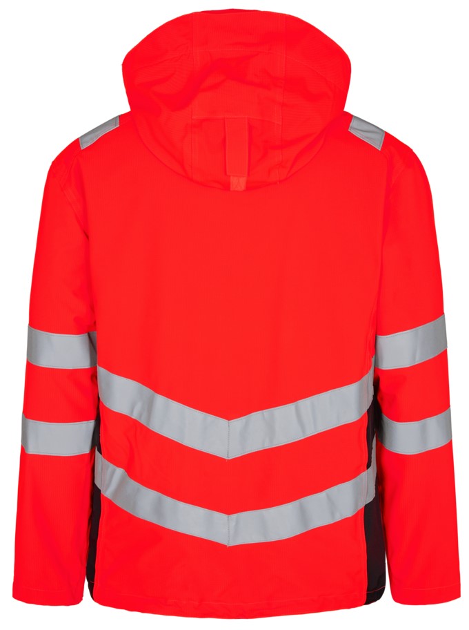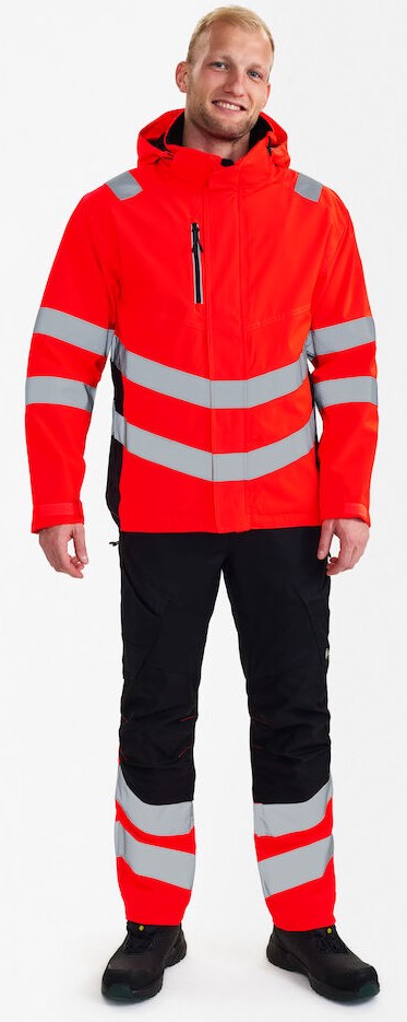 Fluorescent, breathable, waterproof and windproof shell jacket with taped seams and high collar in a modern design. Double button placket with zipper and Velcro fastener at the front. The jacket can be combined with the 1192-236, 1159-158 and 5159-158 models, all of which have a zipper for zipping in. Two spacious side pockets and chest pocket with zipper as well as large inside pockets with Velcro fastener. Detachable, adjustable hood with sufficient space for a work helmet. Adjustable cuffs. Zipper in the lining, suitable for printing/embroidery. Reflective stripes across the shoulders and around the sleeves and body. Clothing class 3, tested after 50 washes.