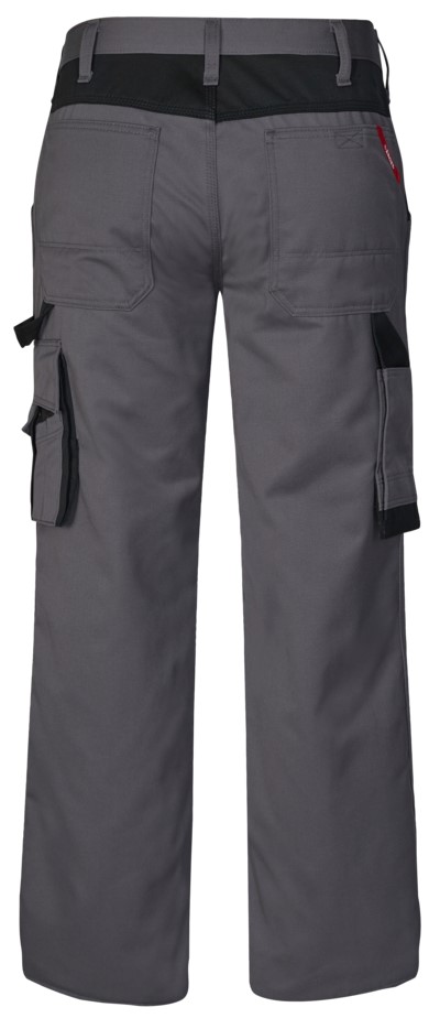 Work trousers with triple topstitching and pleats. Two slit pockets and one coin pocket. Fly with metal zipper. Dark-colored metal trouser button. Two reinforced back pockets, the right one with Velcro fastening. Reinforced folding rule pocket with expansion pleat on the right. Thigh pocket and cell phone pocket with stretch pleats and flap with Velcro fastening and additional pencil pockets on the left/hammer loop on the left. Knee pockets/knee reinforcement with Velcro fastener and two adjustment options for inserted knee pads. Suitable for industrial laundering.