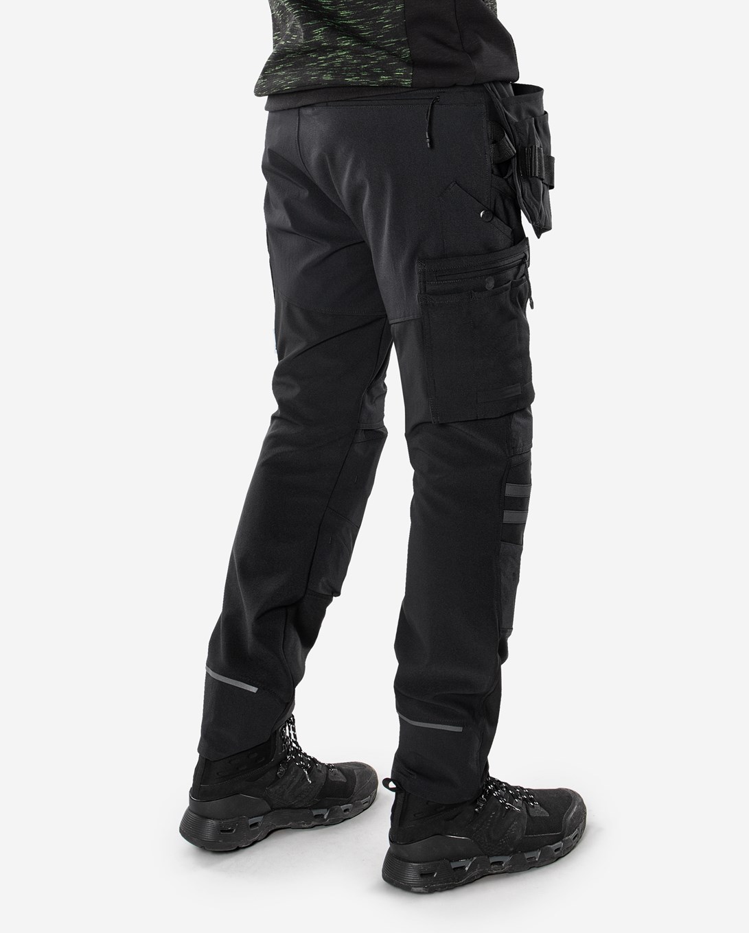 Ruler pocket in ripstop stretch, leg pocket with snap fastener, zippered pocket, pen pocket, 2 tool pockets and button and loop for a work knife