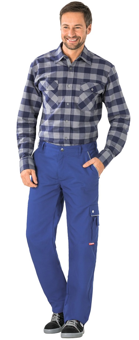 2 eingesetzte Beuteltaschen, rechts doppelte Maßstabtasche, Reflexbiesen an den Tascheneingriffen und den Taschenpatten, links Oberschenkeltasche mit Patte und Druckknöpfen, darauf aufgesetzte Handytasche, Gummizug im Bund, rechts 1 verstärkte Gesäßtasche, Rundbund mit 7 Gürtelschlaufen und Jeansknopf, Reißverschluss im Hosenschlitz.
