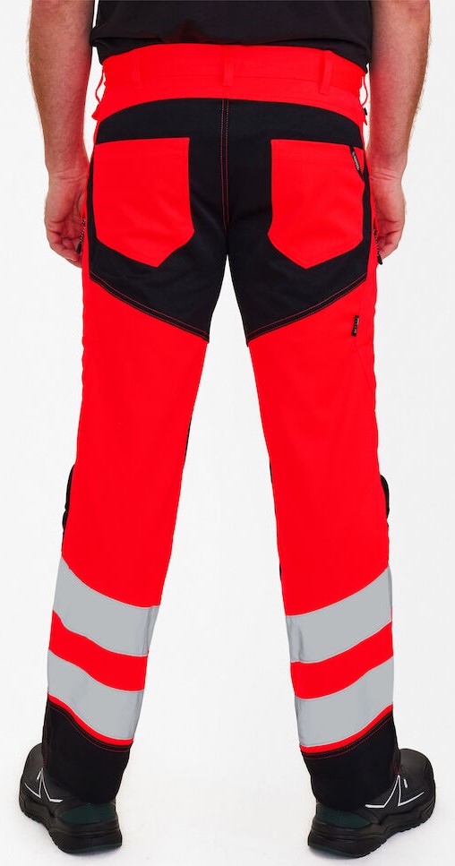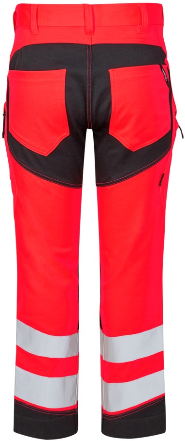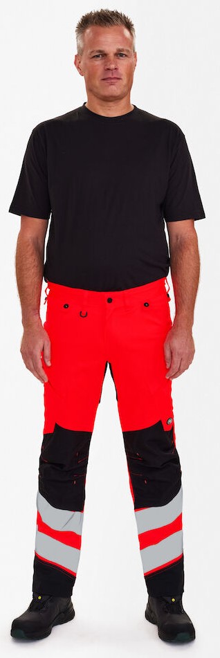 Stretchy, functional and fluorescent trousers in a modern design. Optimum fit with ergonomically shaped knee area. The stretchy fabric ensures optimum freedom of movement and comfort. D-ring at the front for attaching ID cards, for example. Two spacious slanted front pockets. Two back pockets. Two thigh pockets with zippers. The left thigh pocket has an additional cell phone pocket. The right thigh pocket has an attached reinforced ruler pocket with additional dividers. Knee reinforcement/knee pocket with Velcro fastener at the bottom and made of CORDURA® material. Reflective stripes on the lower leg. Wide bottom hem that can be left out if extra leg length is required. Only one seam needs to be undone to lengthen the trousers. The trouser leg is still hemmed. Clothing class 2, tested after 50 washes.
