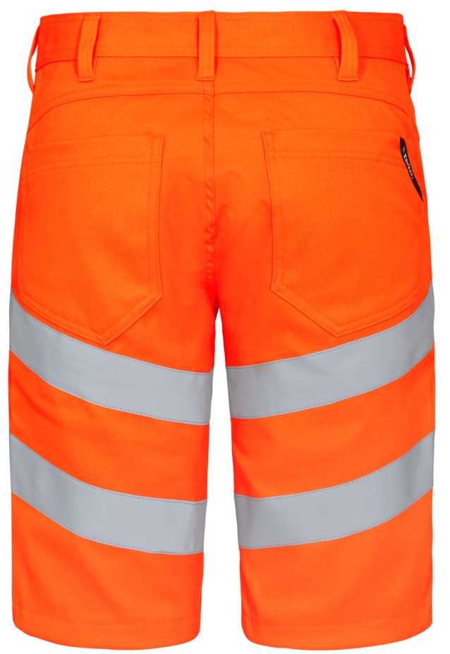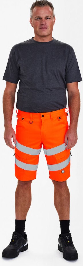 Stretchy, functional and fluorescent shorts in a modern design. Optimum fit. The stretchy fabric ensures optimum freedom of movement and comfort. D-ring at the front for attaching ID cards, for example. Two spacious slanted front pockets. Two back pockets. Two thigh pockets with zippers. The left thigh pocket has an additional cell phone pocket. The right thigh pocket has an attached reinforced ruler pocket with additional dividers. Clothing class 1, tested after 50 washes.