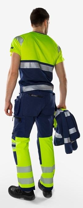 Nachhaltige High-Vis-Handwerker-Stretchhose aus 4-Wege-Stretch aus biobasierten und recycelten Materialien und ausgestattet mit Stretcheinsätzen am Bund für hervorragenden Komfort. Verstärkt an exponierten Stellen für zusätzliche Strapazierfähigkeit. Mit EPD (Environmental Product Declaration).