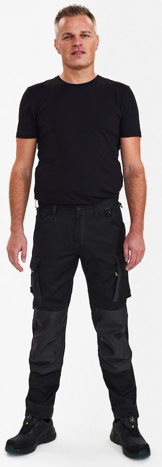 Funktionelle Handwerkerhose mit Stretch und schmaler Passform und vielen praktischen Details. Ergonomisch geformte Knie. Einsätze aus extrem elastischem, atmungsaktivem Stretchmaterial in den Kniekehlen sorgen für noch mehr Tragekomfort. D-Ring vorne z. B. für die ID-Karte. Zwei geräumige, schräg sitzende Einschubtaschen vorne. Zwei Gesäßtaschen mit Patte. Handytasche mit Patte am rechten Oberschenkel. Links sitzt eine Schenkeltasche mit Patte. Die Schenkeltasche besitzt ein zusätzliches Fach mit Reißverschluss. Verstärkte Zollstocktasche mit zusätzlichen Fächern und Werkzeugschlaufen. Schenkeltasche und Zollstocktasche mit freihängendem Boden gewähren optimale Bewegungsfreiheit. Knieverstärkung/Knietasche mit Klettverschluss oben für höhenverstellbare Kniepolster (zwei Einstellmöglichkeiten). Verstärkter Saum der Hosenbeine für extra hohe Verschleißfestigkeit. Gute Sichtbarkeit durch Reflexpaspeln mittig hinten auf den Hosenbeinen. Extra breiter Hosenaufschlag ermöglicht bei Bedarf eine Verlängerung der Schrittlänge. Für die Verlängerung der Schrittlänge ist bloß ein Saum aufzutrennen, dahinter kommt ein zusätzlicher Saum zum Vorschein.