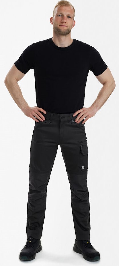 Funktionelle Handwerkerhose aus unserem ENGEL Super Stretch-Material, das verschleißfest und atmungsaktiv ist und mit 56 % recyceltem Polyester hergestellt wird. Beim Design der Hose wurde großen Wert auf hohen Komfort und Bewegungsfreiheit gelegt. Der ergonomisch geformte Kniebereich und der dehnbare Stoff sorgen dafür, dass die Hose in jeder Arbeitssituation bequem zu tragen ist. Die Handwerkerhose hat Knöpfe vorne, an denen bei Bedarf Holstertaschen befestigt werden können. Dies hat den Vorteil, dass man die Holstertaschen einfach und schnell an- und wieder abklicken kann. So müssen z. B. die Holstertaschen nicht geleert werden, wenn die Hose gewaschen werden soll – sie lassen sich vor dem Waschen einfach abnehmen und danach wieder anklicken. Die Hose hat vorne einen praktischen D-Ring für die Befestigung von Dingen wie Ausweisen, sowie viele funktionelle Taschen, z. B. zwei geräumige Schrägtaschen vorne. Zwei Gesäßtaschen. Zwei Beintaschen mit Reißverschluss. Die linke Beintasche hat eine zusätzliche Handytasche. Auf dem linken Oberschenkel befindet sich eine verstärkte Zollstocktasche mit lose hängendem Boden sowie zusätzlichen Unterteilungen. Der Hosenbund ist mit einer praktischen Hammerschlaufe versehen und am rechten Oberschenkel gibt es eine funktionelle Tasche, beispielsweise für ein Lineal oder einen Bleistift. Die Hose bietet 2 Einstellungsmöglichkeiten für das Einsetzen von Knieschutzkissen und eine zusätzliche CORDURA® Verstärkung an den Knien. Für bessere Sichtbarkeit und Sicherheit hat die Hose reflektierende Paspelierungen. Der Arbeitshose hat einen extra breiten Saum unten, der ausgelassen werden kann, wenn zusätzliche Beinlänge erforderlich ist. Um die Hose zu verlängern, muss lediglich eine Naht aufgetrennt werden. Das Hosenbein ist trotzdem noch gesäumt und die Hose kann direkt wieder getragen werden.