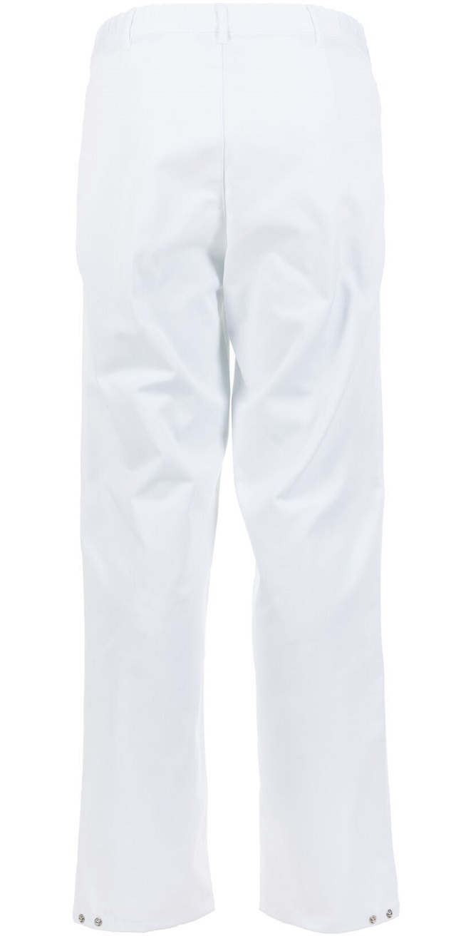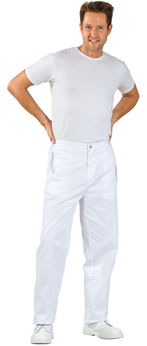 Die reißfeste und strapazierfähige Bundhose ist industriewäschegeeignet, einlaufsicher und neigt nicht zur Fusselbildung. Angelehnt an die Empfehlungen der HACCP und der DIN 10524 für Lebensmittelhygiene. 2 eingesetzte Beuteltaschen, mit Patten und Druckknöpfen zu verschließen, Gummizug im Bund, Rundbund mit 7 Gürtelschlaufen, Reißverschluss im Hosenschlitz, Fußweite mit Druckknopf zu verstellen.