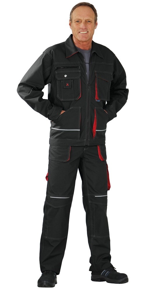 2 aufgesetzte Seitentaschen, 1 Brusttasche links mit Patte und Klettverschluss, doppelte Brusttasche rechts, Handytasche auf der rechten Brust, mit Druckknopf verstellbare Ärmelbündchen, Umlegekragen, Bundweite mit Druckknopf verstellbar, 2 Golffalten im Rücken, Reflexbiesen im Front- und Rückenbereich als Sicherheitsausstattung.