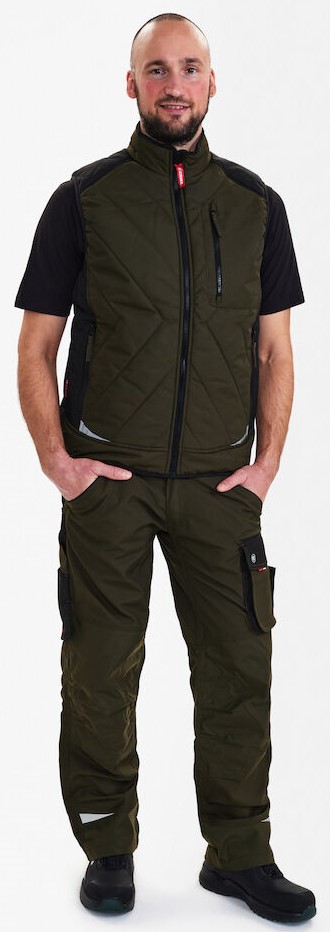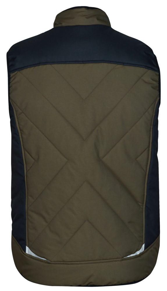 Warme Winterweste mit hohem Kragen und verlängerter Rückenpartie. Weiches Microfleece innen im Kragen. Frontreißverschluss. Zwei geräumige Einschubtaschen und eine Brusttasche, alle mit Reißverschluss. Innentasche ebenfalls mit Reißverschluss. Die Weste hat einen Gummizug in Bund und Armöffnungen, sodass weniger Wind eindringt.