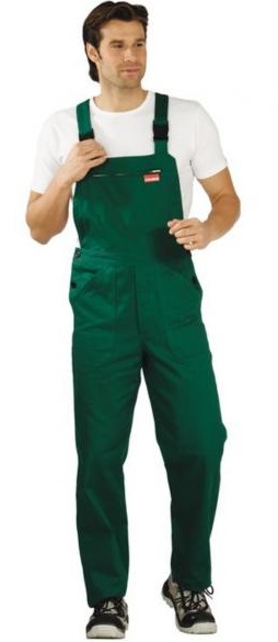 Brustlatz mit verdecktem Messing-Reißverschluss, 2 aufgesetzte, verstärkte Vordertaschen, 1 verstärkte Gesäßtasche, 1 Maßstabtasche, verstellbare Seitenschlitze mit Durchgriffmöglichkeit, geknöpfter Hosenschlitz, hochgezogenes Rückenteil, Hosenträger mit Gummieinsatz, Sicherheitsschnallen an den Trägern.