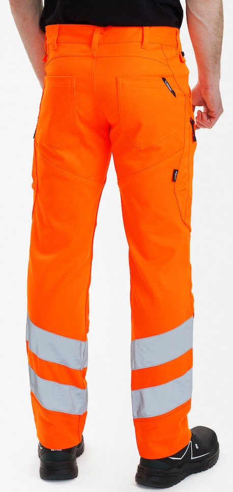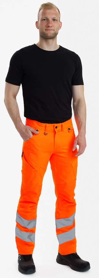 Dehnbare, funktionelle und fluoreszierende Hose im modernen Design. Optimale Passform mit u. a. ergonomisch geformtem Kniebereich. Der dehnbare Stoff sorgt für optimale Bewegungsfreiheit und Komfort. D-Ring vorne für die Befestigung von z. B. Ausweisen. Zwei geräumige Schrägtaschen vorne. Zwei Gesäßtaschen. Zwei Schenkeltaschen mit Reißverschluss. Die linke Schenkeltasche hat eine zusätzliche Handytasche. Die rechte Schenkeltasche hat eine aufgesetzte verstärkte Zollstocktasche mit zusätzlichen Unterteilungen. Knieverstärkung/Knietasche mit Klettverschluss unten und besteht aus CORDURA®-Material. Reflexstreifen am Unterschenkel. Breiter Saum unten, der ausgelassen werden kann, wenn zusätzliche Beinlänge erforderlich ist. Um die Hose zu verlängern, muss lediglich eine Naht aufgetrennt werden. Das Hosenbein ist trotzdem noch gesäumt. Bekleidungsklasse 2. Nach 50 mal Waschen getestet.
