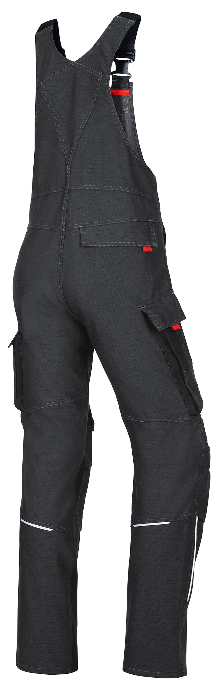 - hochgezogener Rücken, seitlicher Stretchkeil für bequemen Schutz, 1 Zollstocktasche mit aufgesetzten Stifttaschen mit Patte verschließbar, 1 mit Patte verschließbare Gesäßtasche, vorgeformtes Bein, Reflexpaspel seitlich und hinten im unteren Beinbereich, Knieeinschubtaschen für Kniepolster