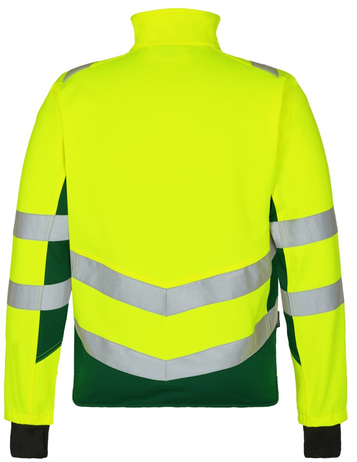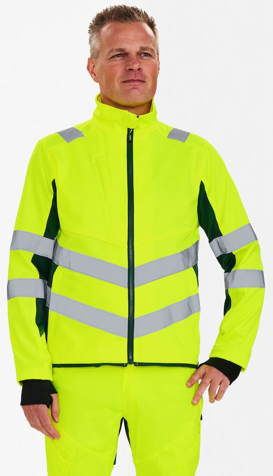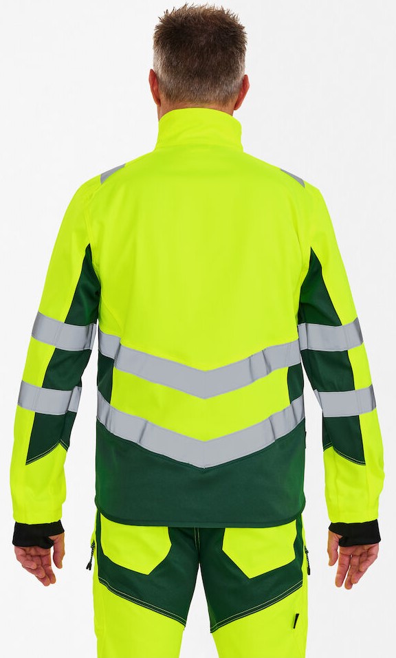 Dehnbare und funktionelle fluoreszierende Arbeitsjacke im modernen Design. Die Jacke hat einen hohen Kragen und ist hinten länger geschnitten. Der dehnbare Stoff bietet viel Komfort und Bewegungsfreiheit. Reißverschluss vorne. Zwei geräumige Seitentaschen sowie eine Brusttasche, jeweils mit Reißverschluss. Zusätzlicher Windfang aus Rippstrick an den Ärmeln. Der Windfang mit Daumenloch kann zum Schutz vor Kälte über die Hand gezogen werden. Reflexstreifen über die Schulterpartie hinweg sowie rund um Ärmel und Taille. Bekleidungsklasse 2. Nach 50 mal Waschen getestet.