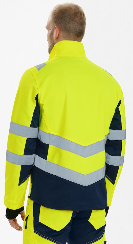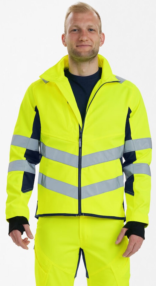 Dehnbare und funktionelle fluoreszierende Arbeitsjacke im modernen Design. Die Jacke hat einen hohen Kragen und ist hinten länger geschnitten. Der dehnbare Stoff bietet viel Komfort und Bewegungsfreiheit. Reißverschluss vorne. Zwei geräumige Seitentaschen sowie eine Brusttasche, jeweils mit Reißverschluss. Zusätzlicher Windfang aus Rippstrick an den Ärmeln. Der Windfang mit Daumenloch kann zum Schutz vor Kälte über die Hand gezogen werden. Reflexstreifen über die Schulterpartie hinweg sowie rund um Ärmel und Taille. Bekleidungsklasse 2. Nach 50 mal Waschen getestet.