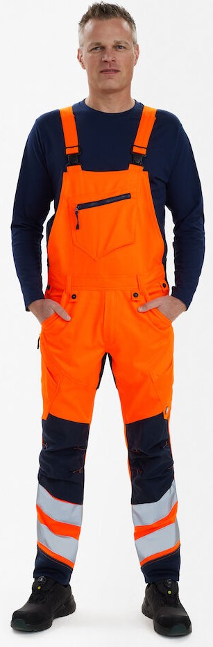 Dehnbare und funktionelle fluoreszierende Latzhose im modernen Design. Der dehnbare Stoff sorgt für optimale Bewegungsfreiheit und Komfort. Optimale Passform mit u. a. ergonomisch geformtem Kniebereich. Hoch geschnittenes Rückenteil und Rippstrickeinsätze an den Seiten sorgen für optimale Passform und Tragekomfort. Verstellbare Träger. Latztasche mit Reißverschluss. Latzinnentasche mit Reißverschluss. Zwei Gesäßtaschen. Zwei Schenkeltaschen mit Reißverschluss. Die linke Schenkeltasche hat eine zusätzliche Handytasche. Die rechte Schenkeltasche hat eine aufgesetzte Zollstocktasche mit zusätzlichen Unterteilungen. D-Ring an der Latztasche für die Befestigung von z. B. Ausweisen. Knieverstärkung/Knietasche mit Klettverschluss unten und besteht aus CORDURA®-Material. Breiter Saum unten, der ausgelassen werden kann, wenn zusätzliche Beinlänge erforderlich ist. Um die Hose zu verlängern, muss lediglich eine Naht aufgetrennt werden. Das Hosenbein ist trotzdem noch gesäumt. Bekleidungsklasse 2. Nach 50 mal Waschen getestet