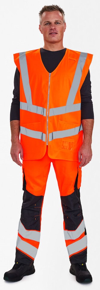 Leichte, bequeme Verkehrsweste mit Frontreißverschluss. Zwei große Außentaschen mit Klettverschluss. ID-Kartenhalter an der linken Tasche. Schlaufe, z. B. für Walkie-Talkie oder Gaswarngerät, an der linken Brustseite. Reflexstreifen am Torso und über den Schultern. Bekleidungsklasse 2. Nach 25 mal Waschen getestet.