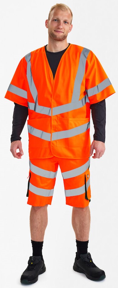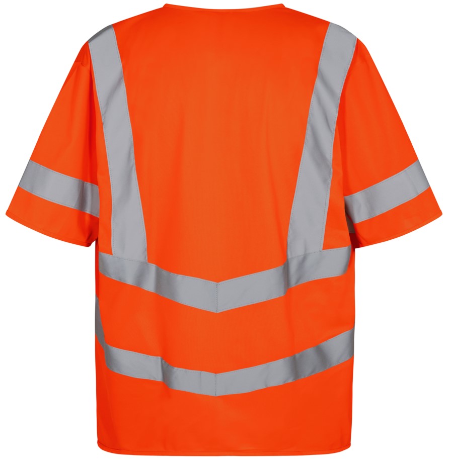 Leichte, bequeme Verkehrsweste mit kurzen Ärmeln und Klettverschluss vorn. Zwei große Außentaschen mit Klettverschluss. Reflexstreifen am Torso und über den Schultern. Bekleidungsklasse 3. Nach 25 mal Waschen getestet.