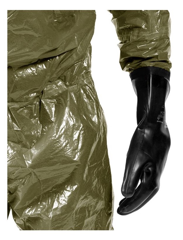 Fest angearbeitete anatomische KCL Butoject 898 Butylhandschuhe, welche auch bei Kälte hochflexibel sind und gute Ozon-, UV- und Temperaturbeständigkeit bieten, runden den Anzug ab. Der Handschuh ist gasundurchlässig und beständig gegen viele Säuren, Laugen, Lösungen, Alkohole, Ester, Weichmacher und Ketone.