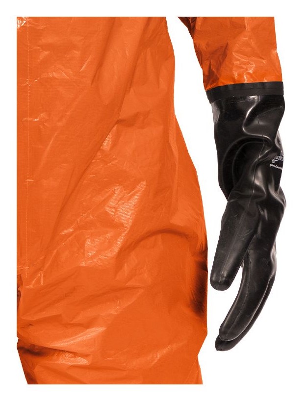 Fest angearbeitete anatomische KCL Butoject 898 Butylhandschuhe, welche auch bei Kälte hochflexibel sind und gute Ozon-, UV- und Temperaturbeständigkeit bieten, runden den Anzug ab. Der Handschuh ist gasundurchlässig und beständig gegen viele Säuren, Laugen, Lösungen, Alkohole, Ester, Weichmacher und Ketone.