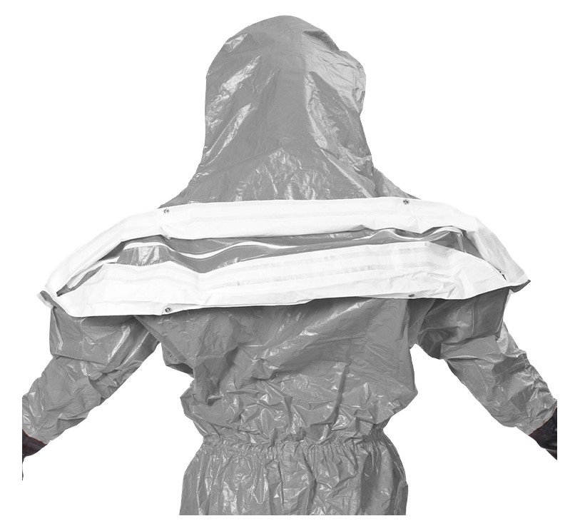 Hergestellt wird der Anzug aus Tychem F, selbiges ist ein leichtes, widerstandsfähiges Material und bietet eine hohe Barriere gegen die Permeation einer Vielzahl von Chemikalien und schützt den Träger vor zahlreichen organischen und hochkonzentrierten anorganischen Chemikalien. Antistatisch ausgerüstet ist es ebenfalls.