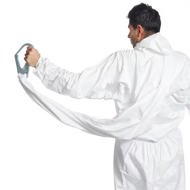Anzug mit zweiteiliger Kapuze. Ergonomisches Schutzdesign. Innenliegende Nähte. Klettverschluss zum anschließen an den Karabiner. "Pass-Through-System" zum Schutz des Verbindungsmittels. Druckknopfverschluss für volle Dichtheit, wenn kein Verbindungsmittel verwendet wird. Selbstklebende Reißverschluss- und Kinnabdeckung (für dichten Abschluss an der Atemschutzmaske) Gummizüge an Arm- und Beinabschlüssen und der Kapuze. Daumenschlaufen. Gummizug in der Taille (eingeklebt). Tyvek® Reißverschluss. Weiß. Antistatisch.