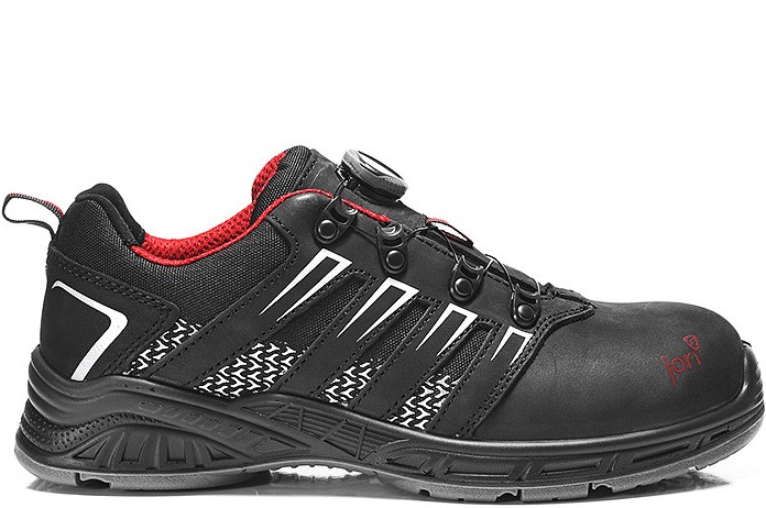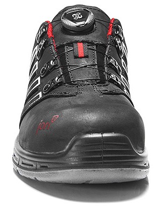 Der sportliche jo_TWIST BOA® Low S1P besteht aus hydrophobiertem Nubukleder und Textilmaterial. Der schwarze Schuh mit grauen Highlights an der Seite des Schafts überzeugt durch seinen modernen Look. Die Sicherheitseigenschaften kommen jedoch nicht zu kurz: eine leichte, aber sehr widerstandsfähige Kunststoffkappe sowie ein metallfreier Durchtrittschutz wehren die Gefahren des Arbeitsalltags erfolgreich ab. Die PU/PU Laufsohle ist gemäß SRC zertifiziert und sorgt für die nötige Rutschhemmung auf glatten Böden. Den modischen Schuh gibt es in den Größen 38 bis 48.