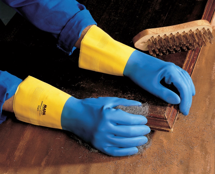 Der Mapa Duo-Mix 405 ist aus einem flexiblen Material für hervorragendes Tastempfinden und ausgezeichnete Fingerfertigkeit. Gute chemische und mechanische Beständigkeit durch Latex-mix. Gute Griffsicherheit durch rutschfestes Profil. Tragekomfort und Schweißabsorbierung. Anwendung: Routinearbeiten in der chemischen Industrie, Reinigungs- und Wartungsarbeiten, Oberflächenbehandlung.