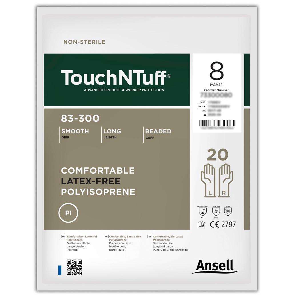 Der aus reinem Polyisopren hergestellte TouchNTuff® enthält kein Naturkautschuklatex und minimiert somit das Risiko einer Typ-I-Allergie. Die Dehnfähigkeit des extrem weichen Polyisoprenfilms und die Herstellung mit neuen, der Anatomie der Hand nachempfundenen Formen gewährleisten eine Passform wie eine zweite Haut und damit einen höheren Tragekomfort. Arbeiter können den Handschuhe viel länger tragen, bevor eine Handermüdung erfolgt. Das Polyisopren ermöglicht eine Tastsensibilität wie Naturkautschuklatex. Die rutschfeste Ausführung bietet eine herausragende Griffsicherheit bei der Handhabung nasser Objekte und verhindert ihr Durchrutschen. Die verbesserte Polymerbeschichtung der Innenseite des Handschuhs ermöglicht ein einfaches An-/Ausziehen mit nassen und trockenen Händen. Konstruktion und Wandstärke für eine einfache, komfortable doppelte Behandschuhung.